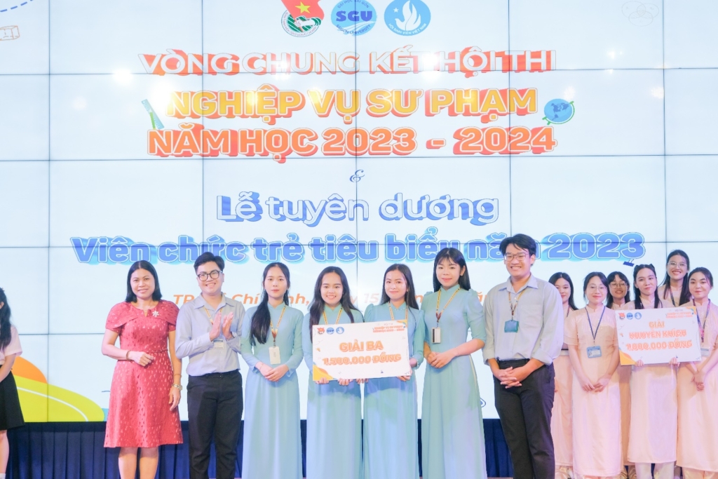 Đồng thời, nhân dịp kỷ niệm 41 năm ngày Nhà giáo Việt Nam (20/11/1982 – 20/11/2023) Đoàn Thanh niên – Hội Sinh viên trường long trọng vinh danh 18 “Viên chức trẻ tiêu biểu” trường Đại học Sài Gòn năm 2023. Để nhận được danh hiệu “Viên chức trẻ tiêu biểu”, các giáo viên, giảng viên, chuyên viên trẻ của chúng ta phải hội tụ đầy đủ các tiêu chuẩn “Tiêu biểu trong đạo đức”, “Tiêu biểu trong chuyên môn”, “Tiêu biểu trong cống hiến”. Như lúc sinh thời, Chủ tịch Hồ Chí Minh luôn nhấn mạnh đến việc học tập, vấn đề cốt lõi để các thế hệ thanh niên trang bị cho mình sự hiểu biết, vốn kiến thức, một trong những điều kiện tiên quyết để đảm bảo cho các thế hệ thanh niên có thể vươn mình ra biển lớn, lấy sức trẻ làm giàu cho Tổ quốc, quê hương. Đó cũng là kim chỉ nam cho đoàn viên, thanh niên, thế hệ trẻ trường Đại học Sài Gòn. Không chỉ ở các bạn sinh viên mà các Thầy, Cô giáo, các Cán bộ viên chức trẻ cũng đã không ngừng nỗ lực, cố gắng và phấn đấu để đạt được các giải thưởng, danh hiệu cao quý.
